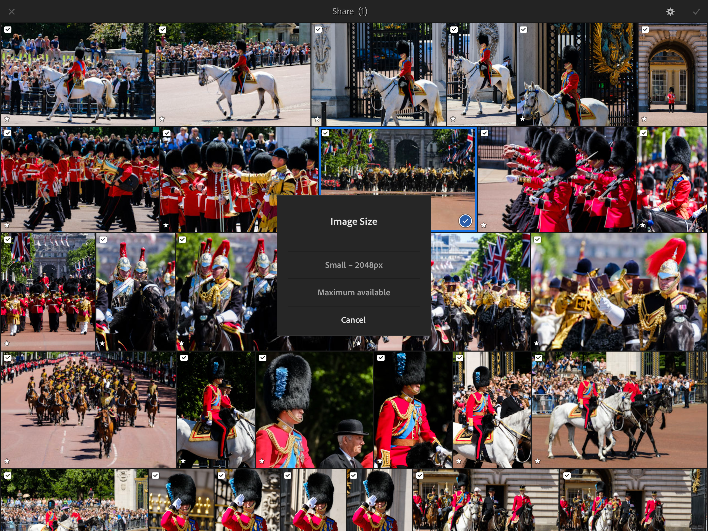 I now export the images from Lightroom to the camera roll (this is a slow process as there is a limit on exporting 15 at a time), selecting the maximum size option.  This leaves just the edited selected images on the camera roll ready for captioning and sending.
