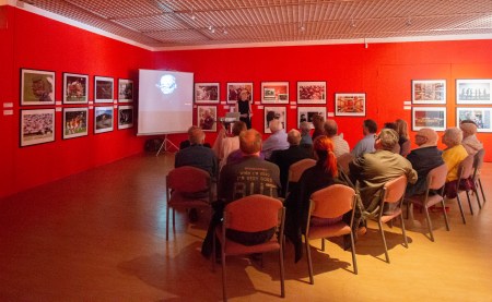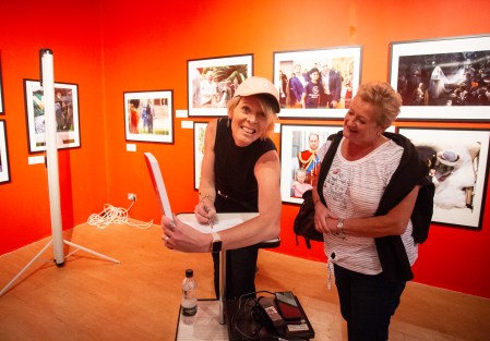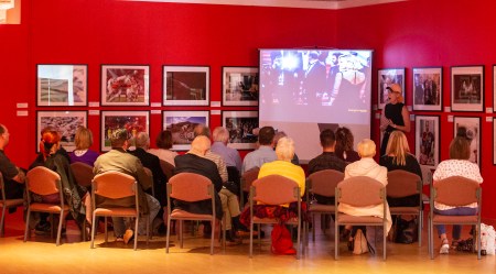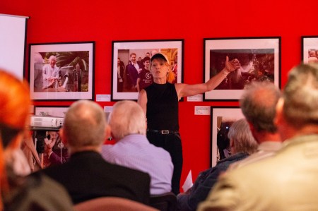 Celebrity photographer and BPPA Board member Julie Edwards speaks at The Potteries Museum and Art Gallery in Stoke-on-Trent on 18th August 2019 as part of the BPPA Assignments exhibition.