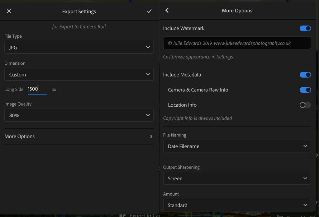 Each export option contains it’s own settings which are far more detailed than in previous releases. Use the More Options to expand the settings. As each has it’s own settings it is now possible (for example) to configure the Save to Camera Roll to save a smaller image with a watermark suitable for social media whilst the Share To… option exports an image suitable to newspapers