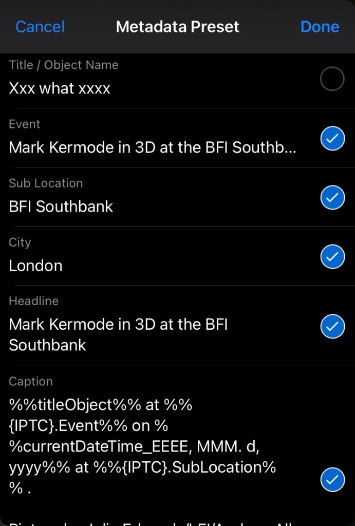 First a basic preset of mine (from a Kermode 3D show) where the caption is automatically built from the Title (as added in Lightroom) and a number of other fields. For this show I know the location and all the other details. The only things that change are the subject/person. In the image (Title) and the Date.