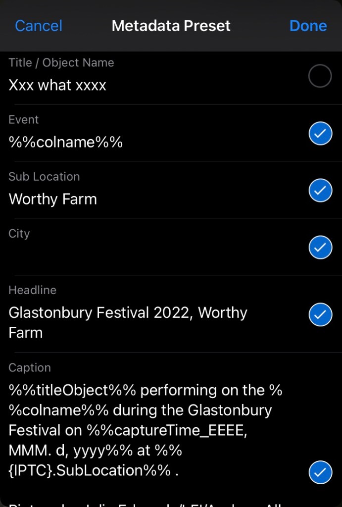 And the next example is the template I used at Glastonbury this year. Note. That I have brought the %%colname%% variable into play (Collection name). This gave me the simple solution for ever changing locations (or events), multiple image collections, one for each stage or location, sending images from Lightroom direct into the correct collection building a complex caption.