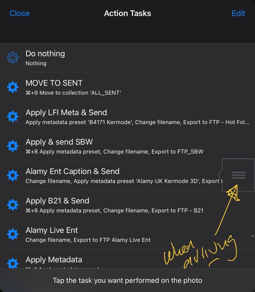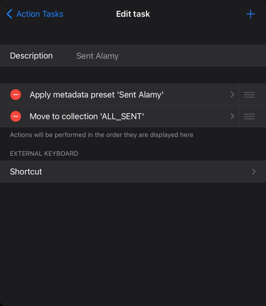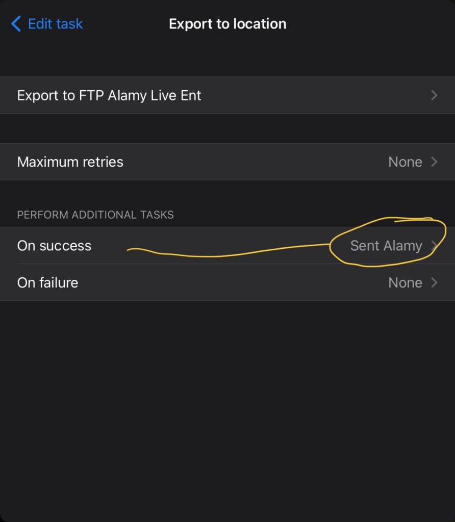 That action on my system, changes the file name to suit the destination (I wont break this down – it should be self evident once you add this task to your action) then it applies one of the Metadata presets (as I showed a few posts back). Finally it exports to the FTP location.