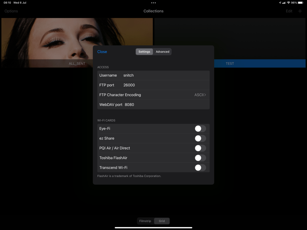 A very short post on how to get the images out of ShutterSnitch and on to a main PC. The app, when running offers two methods of connection: FTP or Webdav (accessible using Finder on a mac). The username and connection settings are shown in the main settings dialog for ShutterSnitch, it is this username plus the password configured when the ShutterSnitch was first set up that are used to connect.