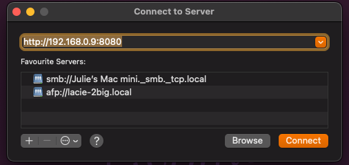 Here I am using the Connect to Server tool from the Go menu in finder on my MacBook. Note the use of the webdav port listed above in conjunction of the IP address of the iPad setting on the WiFi network (the IP address for the iPad can be found by using the i icon in the network settings.