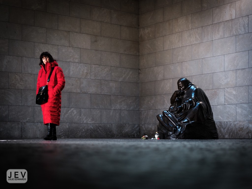 The final image, taken on my final day in Berlin on this trip was taken inside the Neue Wache, a place I could spend hours inside, in silence. I find it incredibly moving and peaceful at the same time. I had been sitting in the corner for quite a while, almost in a meditative state with the camera on the floor just waiting for the feeling to be right to release the shutter. A couple walked in, both wearing red. They waked to the “Mother with dead son” work, paused for a short while then turned and headed back out. The red contrast felt right so I released the shutter with a resounding “thunk” the woman paused, turned and cocked her head, mirroring the mother, obviously noticing me for the first time.. “thunk” again… and thank you…. (1/100th @ F2.8 / 400ISO)