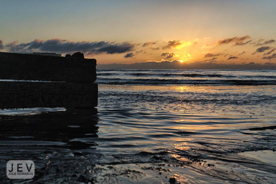 Minutes before the rock-pool was still and undisturbed. I crouched, waiting for the sun to breach the clouds at about 7:40. The tide beat the sun, disturbing my nice still shot.