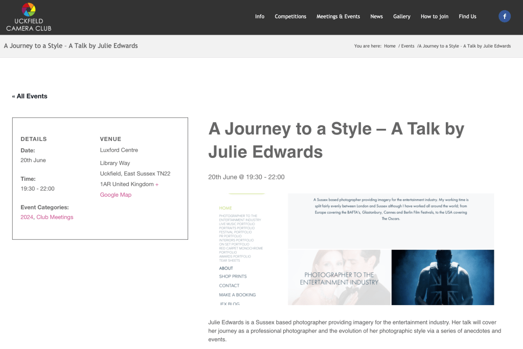 For the last few years my talk has been about how press photography, in particular how entertainment & royalty press photography, works. When I was asked to talk at Uckfield Camera club I thought it was time for an update, so I am tweaking my presentation to talk more about how I built my career and the journey to have the confidence to create the style of images I want to create.