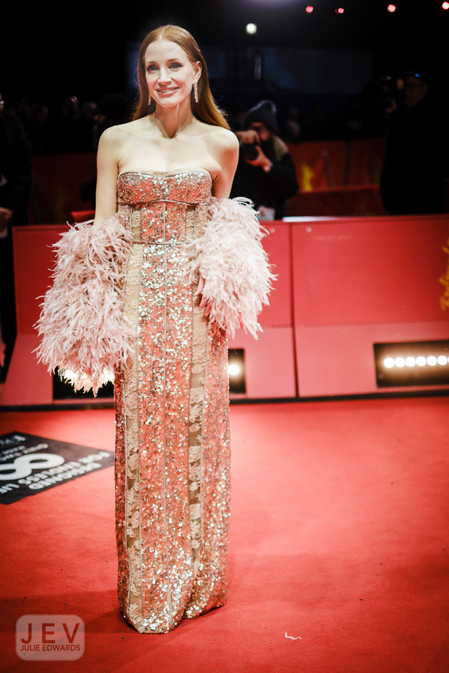 Jessica Chastain poses on the red carpet at the World premiere of Dreams during Berlinale (Berlin Film Festival) at Berlinale Palast on 15 February 2025. X-H2S 35 mm ISO 400 1/800 sec at f – 1.4