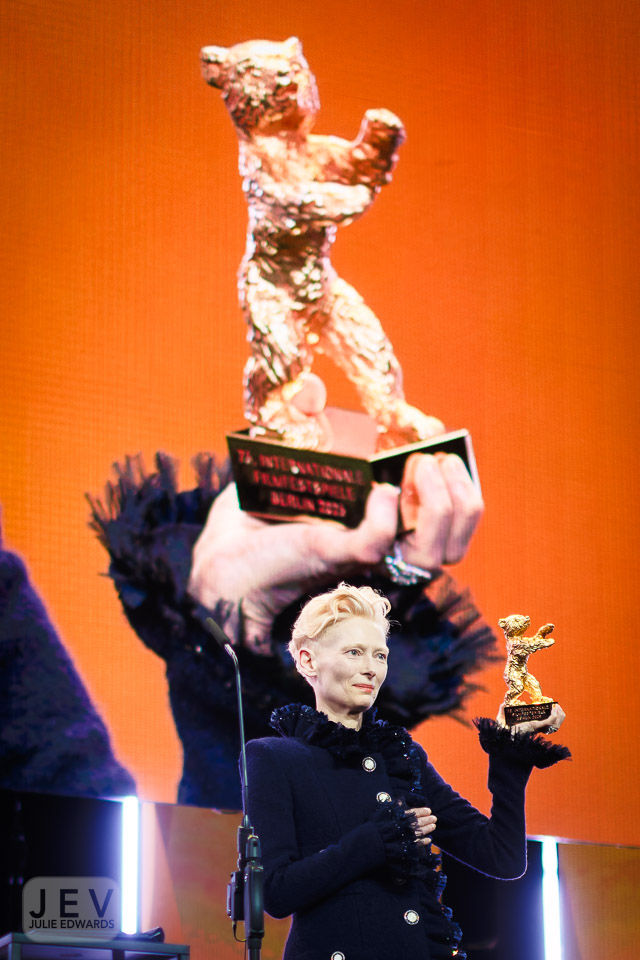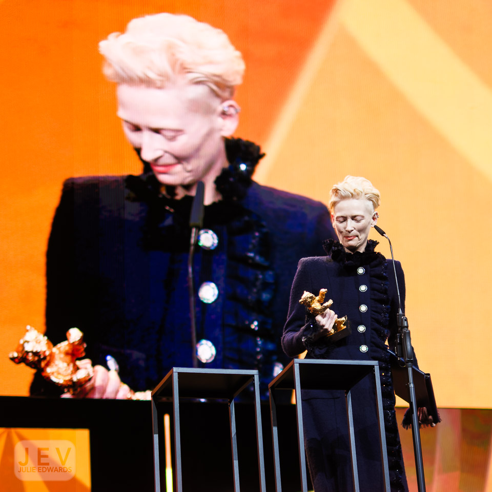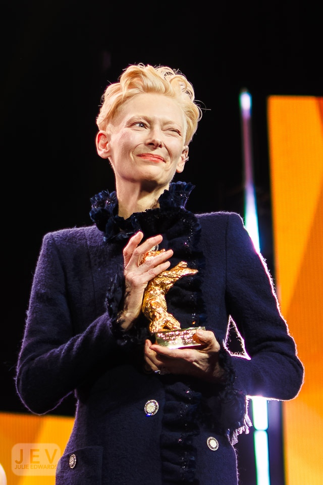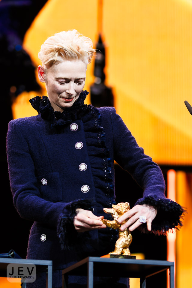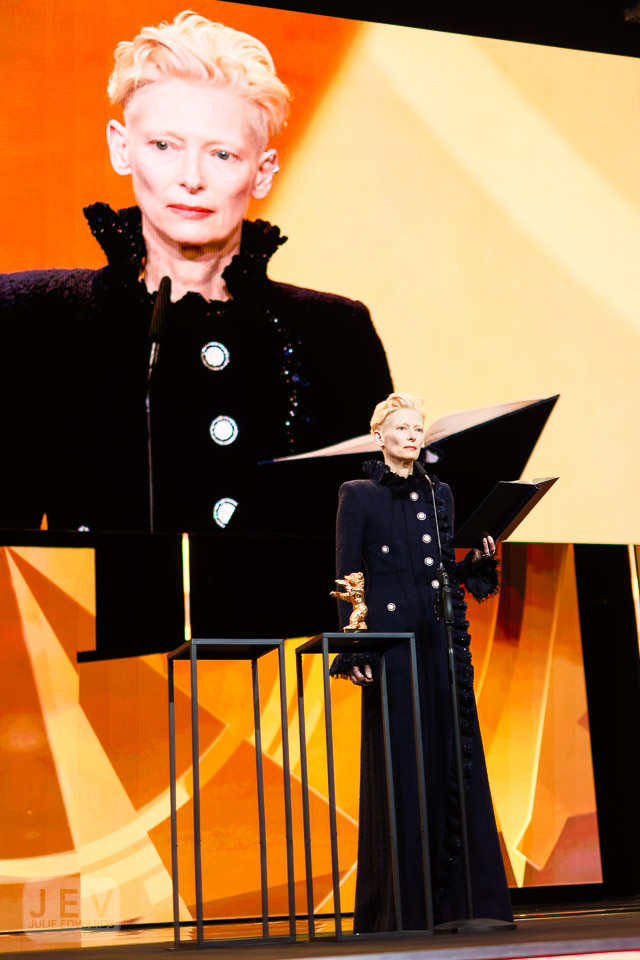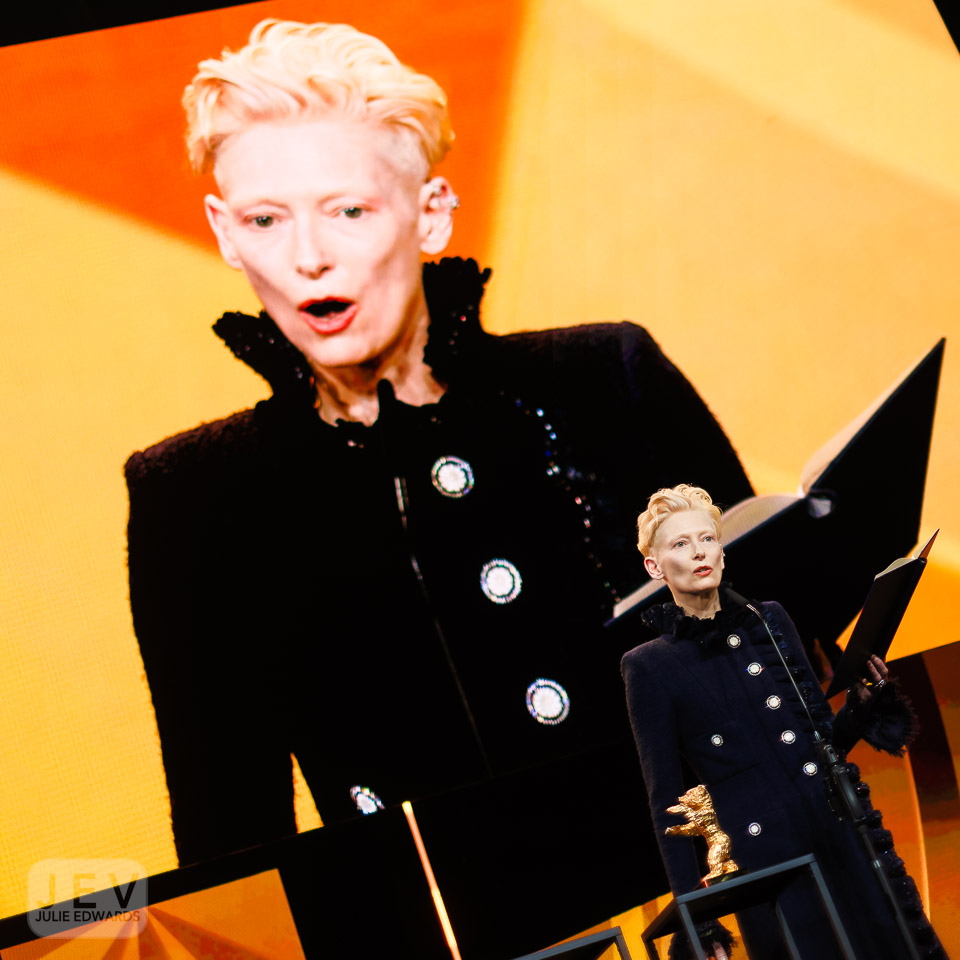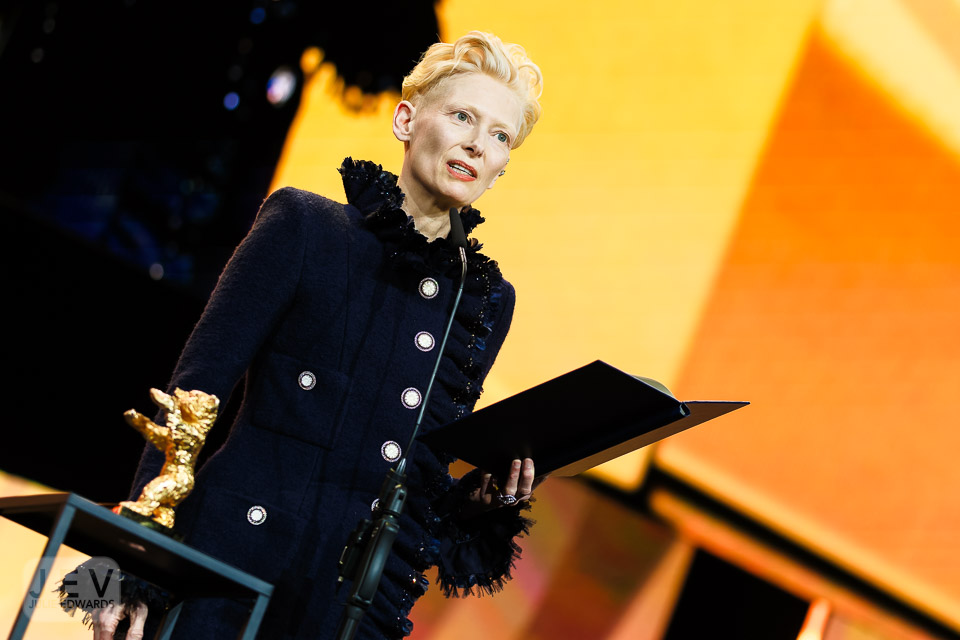 Tilda Swinton on stage at the Opening Night Ceremony during Berlinale (Berlin Film Festival) at Berlinale Palast, Berlin, , Germany on 13 February 2025. Tilda was presented with the Golden Bear by Edward Berger. X-H2 XF35mm ISO 640 1/250 sec at f – 1.4