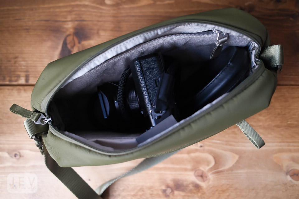 Its tight with the GFX but after this last weekend with it, it functioned well as both a basic handbag/shoulder bag as well as walk-around camera bag.The best thing is it just looks like a normal shoulder bag, with no hint of cameras….
