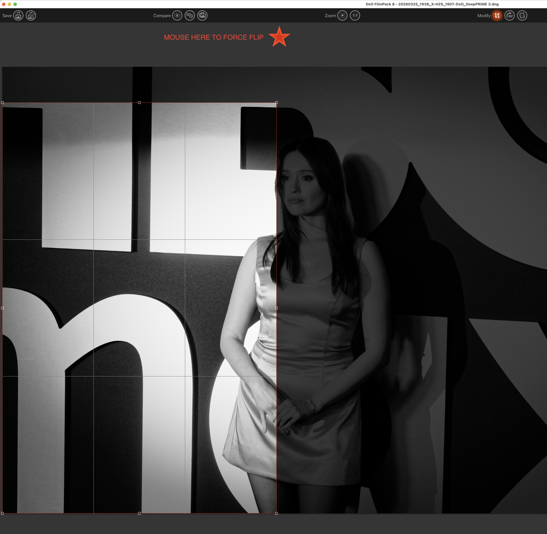One of the issues I wanted to solve was having independent crops of the monochrome images vs the colour. Filmpack has it’s own crop tool, and straightening too, so in theory, no issue.