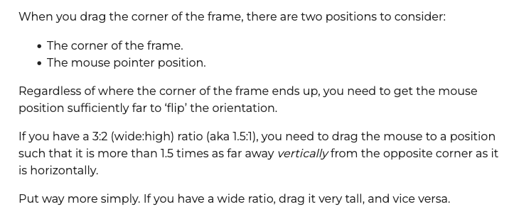 So I was just not “forceful” enough with my mouse position. I needed to move the mouse to a position where the software has no choice but to flip the crop orientation.